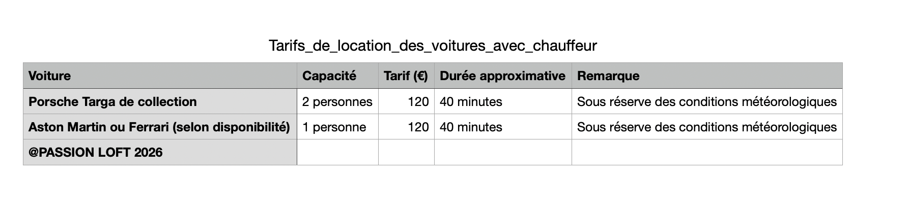 Une escapade exclusive sur les plus belles routes du littoral.Un service sur mesure pour une expérience inoubliable. Que ce soit pour une balade romantique à deux (exemple : Porsche Targa de collection) , ou une sortie individuelle en GT (exemples : Aston Martin, Ferrari….)